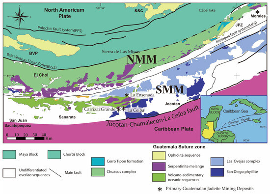 The Guatemala Suture Zone (GSZ) constitutes a key tectonic boundary demarcating the convergence of the North American and Caribbean plates [19]. This composite structural domain integrates ophiolitic fragments (e.g., Juan de Paz massif), serpentinite mélanges, and metavolcanic-sedimentary sequences, tectonically interleaved with high-grade metamorphic assemblages—including the schist-gneiss-marble suites of the Chuacús and Las Ovejas complexes—along the active Motagua Fault System (MFS) (Figure 2). The North Motagua Mélange (NMM) north of the MFS contains high-pressure metabasites occurring as garnet amphibolites, garnet blueschists, retrograde clinozoisite-bearing eclogites, jadeitites, albitites, and omphacite-taramite rocks, which collectively record metamorphic gradients from greenschist-blueschist facies (200–400 °C, ≤1 GPa) to eclogite facies conditions (620 °C, ~1.7 GPa) [20,21,22,23]. Conversely, the South Motagua Mélange (SMM) preserves lawsonite eclogites, glaucophane-bearing metabasites, and jadeitites indicative of ultrahigh-pressure/low-temperature (UHP-LT) regimes (~2.6 GPa, 470 °C) [24], although epidote amphibolite blocks near La Ceiba denote localized thermal anomalies within this cold subduction system [25,26,27].