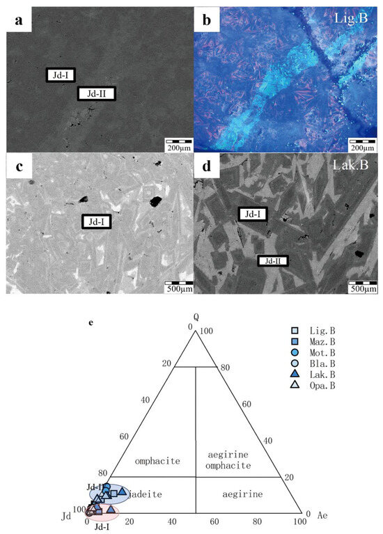 (a) Backscattered electron (BSE) image and (b) CL image of thin section Lak. B, characterized by dominant blue and red luminescence with vein-like bands exhibiting blue-green luminescence. The Jd-II veins intrude in banded patterns, associated with fracturing and alteration of the host jadeite substrate. (c,d) BSE micrographs of the specimen Mot.B reveal two distinct generations of jadeite, where the first generation displays pronounced zoning, while the second generation fills fractures; (e) Jadeite-aegirine-quartz (Jd-Ae-Qtz) ternary diagram showing the compositional variations in jadeite in samples Lig.B, Mot.B, Lak.B, Bla.B, Maz.B, and Opa.B.