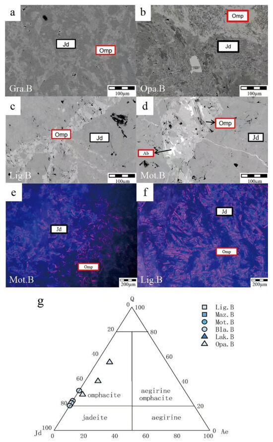(a) Backscattered electron microscopy visualization of thin section sample Gra.B; (b) BSE image of thin section Opa.B; (c) BSE image of thin section Lig.B; (d) BSE image of thin section Mot.B. Omphacite exhibits vein-like distributions in all samples (a–d). (e) CL image of thin section Mot.B; (f) CL image of thin section Lig.B: Host minerals exhibit dominant dark blue, blue, and red luminescence, contrasting with non-luminescent to bluish-black omphacite veins due to Fe-Mg enrichment suppressing CL response. (g) Quartz-Jadeite-Aegirine (Qtz-Jd-Ae) ternary diagram of omphacite in samples Opa.B and Bla.B.