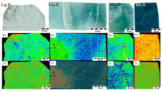 Micro-X-ray fluorescence (m-XRF) elemental mapping of samples Bla.B, Gra.B, Maz.B, and Lig.B reveals that the distributions of Fe and Ti exhibit a correlation with blue color saturation.