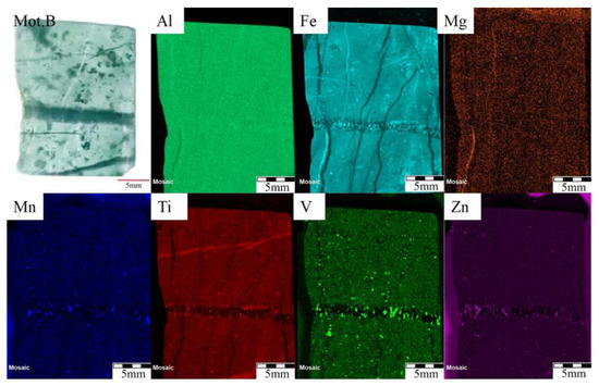 Micro-X-ray fluorescence (μ-XRF) mapping revealed the two-dimensional distribution and relative concentrations of major, minor, and trace elements across the jadeite sample surface (Figure 11). These results provide direct spatial evidence supporting these spectroscopic observations, showing Fe-Ti covariance in blue-colored regions with color intensity positively correlating with elemental concentrations (reddish hues indicating higher concentrations). This spatial correlation directly links octahedral Fe3+ occupancy with the 437 nm absorption feature while revealing the contribution of Fe2+→Ti4+ intervalence charge transfer [16] to the blue coloration of Guatemalan jadeite (Figure 10).