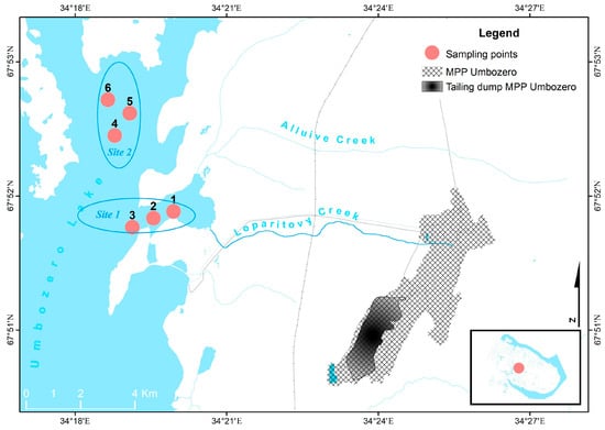 Lake Umbozero is a large freshwater lake in the Lovozero District of the Murmansk Region, in the southwestern part of the Kola Peninsula, and is classified as a fishery water body of the highest category. Samples of BSs were collected in 2025 at two points: near the site of the enterprise’s wastewater intake (Site 1) and to the north, at a considerable distance from the mine (Site 2) (Figure 1).
