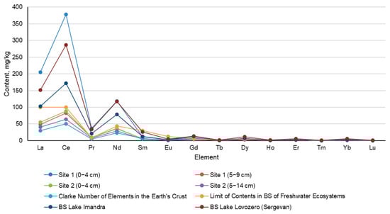According to the calculated Igeo value, the pollution of the BSs of Site 2 of Lake Umbozero belongs to the unpolluted category. At the same time, for Site 1, the level of pollution of the BSs with light REEs varies from unpolluted to moderately polluted.