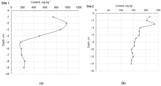 The vertical distribution of the content of the ∑REE in the selected samples of BSs of Lake Umbozero: (a) Site 1; (b) Site 2.