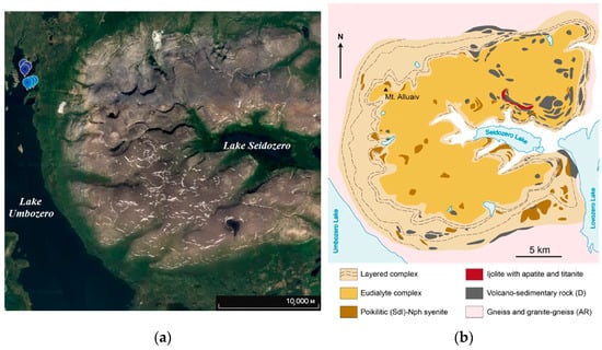 - Mikhailova, J.A.; Ivanyuk, G.Y.; Kalashnikov, A.O.; Pakhomovsky, Y.A.; Bazai, A.V.; Yakovenchuk, V.N. Petrogenesis of the Eudialyte Complex of the Lovozero Alkaline Massif (Kola Peninsula, Russia). Minerals 2019, 9, 581. [Google Scholar] [CrossRef]