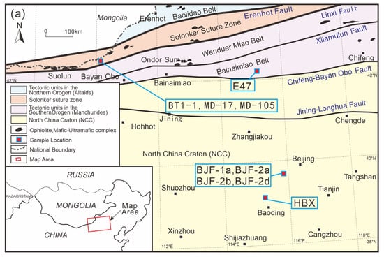 Nine slate samples were analyzed in this study (Table 1). Four of these samples were collected from the Central Asian Orogenic Belt (CAOB), while the other five samples were from the North China Craton (NCC) (Figure 1a). The CAOB formed by subduction and it is considered as an accretion of the Paleo-Asian Ocean (PAO) during the Neoproterozoic to Early Mesozoic. The CAOB is the largest accretionary orogenic belt in the world [24]. It occupies approximately 30% of the land area in Asia and contains a complex geological record of amalgamated accretionary zones and collisional sutures between the major cratons, namely Baltica, Siberia, Tarim, and NCC [29,30]. There are four samples collected in CAOB, three of them (BT1-1, MD-105, MD-17) from the Solonker Suture Zone and one (E47) from the Bainaimiao Belt [31,32].