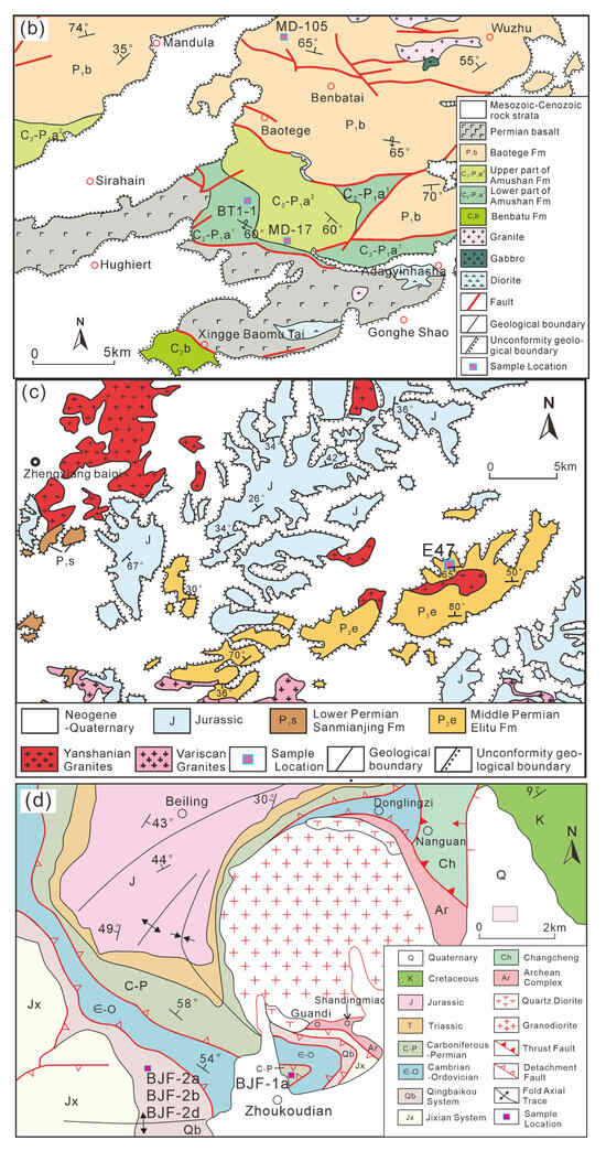 In the Mandula area of Damao Qi, located in the middle of the Solonker Suture Zone, the lower part of the Upper Carboniferous–Lower Permian Amushan Formation is characterized by tuffaceous sandstone and siltstone; graywacke feldspar sandstone interbedded with siltstone and tuff; and bioclastic limestone interbedded with tuff (Figure 1b). The upper part consists of sandstone and feldspar quartz sandstone interbedded with sandy slate. The Amushan Formation is unconformably overlain by the Lower Permian Baotege Formation. In this area, the lower part of the Baotege Formation is lithologically composed of glutenite and conglomerate interbedded with dacite, slate, and limestone. The middle part is thick-bedded volcanic conglomerate interbedded with gray-black volcanic ash tuff. The upper part is medium-coarse grained graywacke interbedded with glutenite, tuff, and limestone [26]. Sample BT1-1 was collected from the lower part of the Amushan Formation, while sample MD-17 was collected from the upper part of the Amushan Formation and sample MD-105 was collected from the Permian Baotege Formation.
