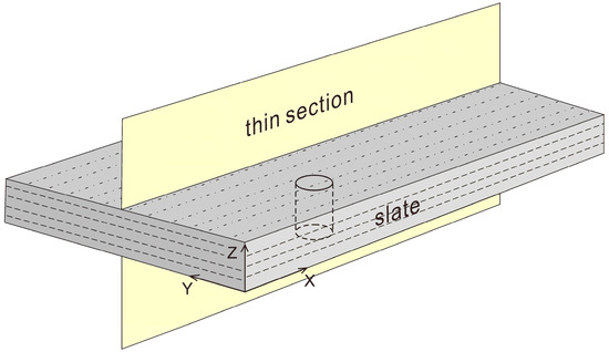 The slate samples collected in the field were cut into thin sections mounted on a glass slide, with a thickness of 30 μm, and then polished. The cutting direction (Figure 3) was perpendicular to the slaty cleavage (XY plane), i.e., the thin sections were oriented along the plane containing the X-axis and Z-axis.