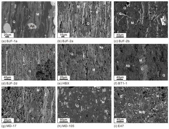 The BE-SEM images in Figure 4 display a wide diversity and considerable heterogeneity. BJF-1a is characterized by a regular fabric of flattened muscovite (M) and quartz grains (Q) intercepted by equiaxed apatite (A) (Figure 4a). Also, BJF-2a displays a very high alignment of chlorite (bright) and muscovite (bright grey), with extreme aspect ratios (~20). Quartz (darker grey) is also flattened, but less extreme (~5) (Figure 4b). BJF-2b is similar to BJF-2a but the alignment is not as pronounced, with euhedral muscovite crystals in different directions (Figure 4c). There are some fairly large ilmenite crystals (I). BJF-2d has a smaller chlorite content but some larger unbent and perfectly aligned crystals that appear to have crystallized in a late stage (Figure 4d). In HBX, the fabric is less regular, with some highly flattened chlorite (C) but less flattened and less aligned muscovite, some perpendicular to the cleavage plane (M). Also, quartz displays only moderate flattening (Q) (Figure 4e).