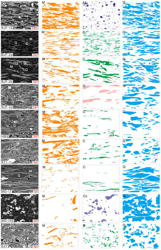 To achieve accurate segmentation and visualization of quartz, muscovite, and chlorite in SEM images, the following approach is employed: SEM images are imported into CorelDRAW 2020 [https://www.coreldraw.com/en/product/coreldraw] for manual boundary tracing of each mineral phase, with subsequent color filling. For instance, muscovite is rendered in light brown, chlorite in green, and quartz in blue (Figure 5). Critical operational criteria include ensuring non-intersecting and non-overlapping boundaries for grains of the same mineral to prevent misclassification during subsequent ImageJ [https://imagej.net/ij/download.html] processing, which could introduce errors in structural parameter quantification. All intact mineral grains, excluding edge-incomplete ones, are designated as statistical objects. Post-tracing, single-mineral images are exported in “.tif” format with RGB color mode and a resolution of 600 dpi to preserve morphological details. Figure 5 shows the delineation of mineral boundaries of nine samples. The first column on the left is the original SEM image, and the second to fourth columns are the outlined minerals. Prior to delineating mineral boundaries, it is necessary to first determine the mineral composition, and the specific delineation techniques and methods will also affect the final analysis results.