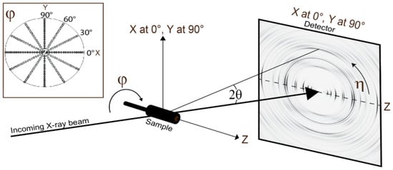 Figure 6. Schematic of the X-ray diffraction experiment with incident X-ray (left), sample, and 2D detector. Images are recorded at different rotation angles ϕ. Pole-figure on top left displays coverage with 6 rotations at 30° intervals. In the actual experiment, 18 images were captured at 10° intervals.