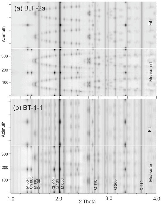 Figure 7 shows “unrolled” diffraction images of samples BJF-2a and BT-1-1, plotting 2θ as function of azimuth. They both display a strong preferred orientation, expressed in strong azimuthal intensity variations. Image intensities are at the bottom and the Rietveld fit is at the top. There is excellent agreement. After fitting with MAUD, volume fractions of the main minerals are obtained. Quartz, muscovite and chlorite are the main phases of the samples (Table 4).