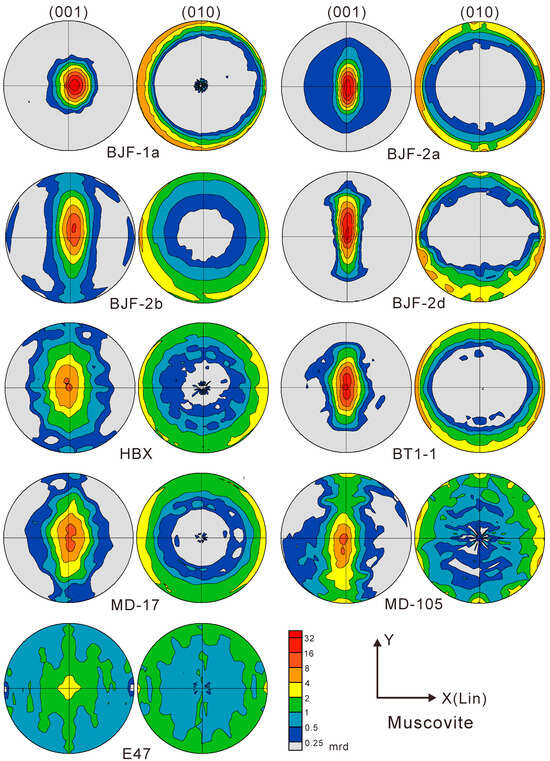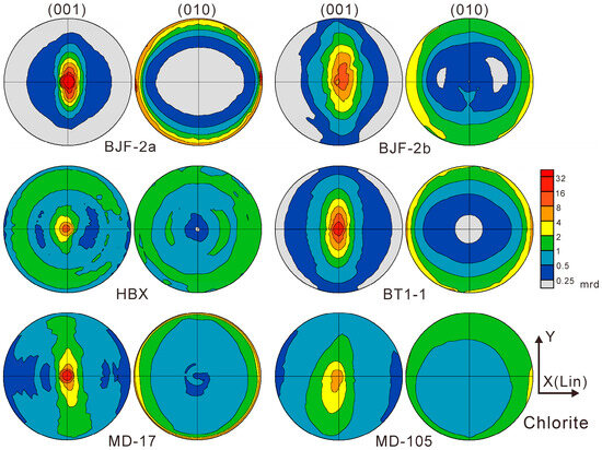 The maximum values of the (001) pole-figures of muscovite range from 3.9 mrd (E47) to 54.7 mrd (BT1-1). Muscovite in BJF-1a, BJF-2a, BJF-2d, and BT1-1 has strongest preferred orientation. For chlorite, the maximum values of the (001) pole-figures range from 7.3 mrd (MD105) to 104.4 mrd (BJF-2a). The (001) pole-figures of muscovite (Figure 8) and chlorite (Figure 9) show significant bending around the x-axis (lineation).