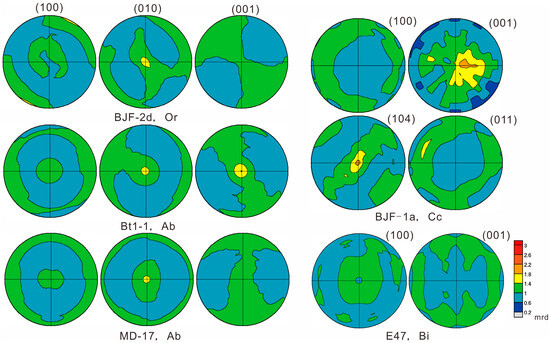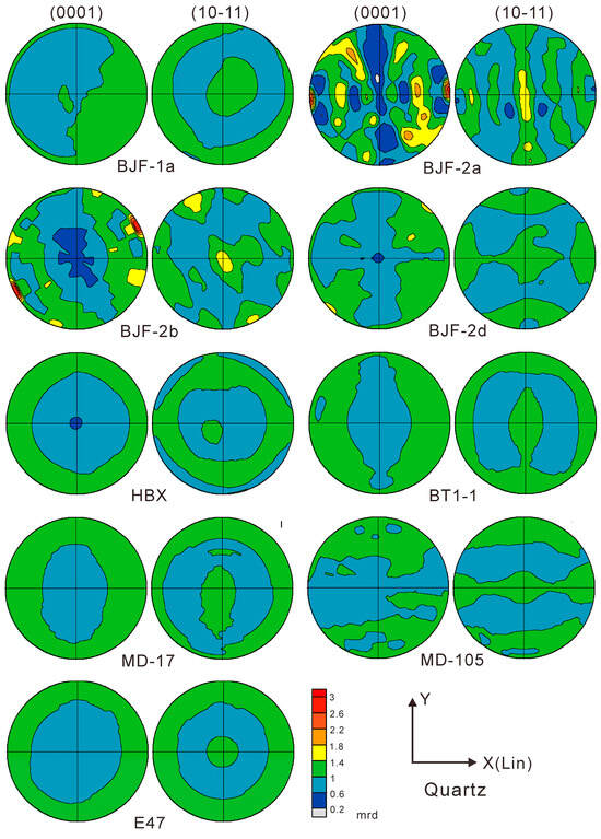 The CPOs of quartz (Figure 10), orthoclase, albite, calcite, and biotite are very weak (Figure 11). The maximum values of the (0001) pole-figures of quartz range from 1.1 mrd to 2.9 mrd, without obvious CPO. This is different from SPO where the major/minor ratio of quartz ranges from 1.83 to 6.33, documenting elongated characteristics, but the CPO is not directional (Table 3).