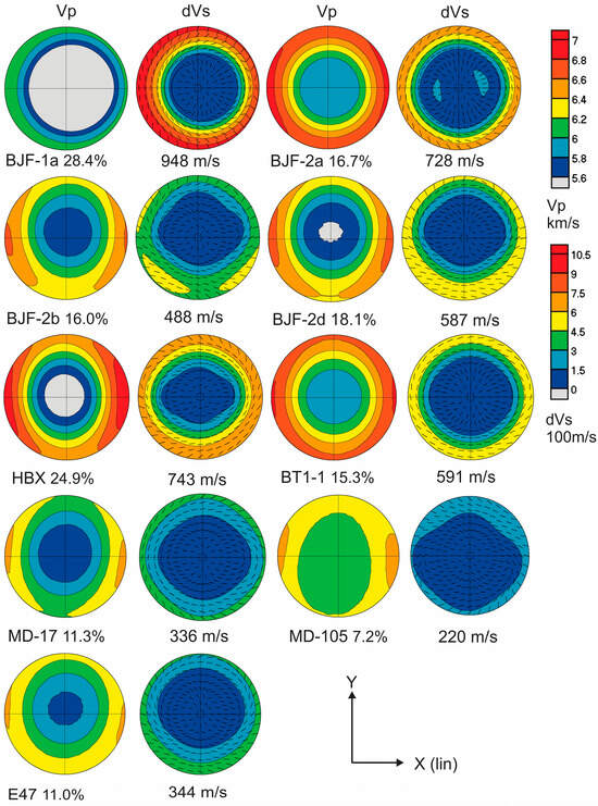 Elastic properties of textured individual phases were then combined, taking volume fractions into account (Table 4), and averaged stiffness tensors for all samples are displayed in Table 7. Subsequently, seismic velocities (compressional (Vp) and shear-wave splitting (dVs)) in different directions were calculated and represented as pole-figures in the same coordinates as crystallographic pole-figures (Figure 8, Figure 9, Figure 10 and Figure 11) in Figure 12. For easier comparison, the same density (2.75 g/cm3) was assumed for all samples. Figure 12 also shows Vp anisotropy (An% = (200(Pmax Vpmax − Vpmin)/(Vpmax + Vpmin)) and maximum shear-wave splitting (dVs). P-wave anisotropies range from 28.4% (BJF-1a) to 7.2% (MD-105), which can be attributed to sheet silicate content (muscovite and chlorite, with high alignment, Figure 4 and Figure 5) and high elastic anisotropy. Samples with low anisotropy such as MD-105 have only 29% muscovite+chlorite, E47 38%, and MD-17 27%. For shear-wave splitting pole-figures, the fast polarization direction is also indicated as black lines in Figure 12. Shear-wave splitting ranges from 948 m/s (BJF-1a) to 229 m/s (MSD-15).