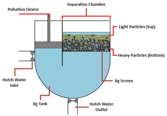 Ambrós (2020) [21] explains that the general scheme of most jigs consists of a container divided into two compartments, with one consisting of a separation chamber where feed particles are located on a supporting sieve and through which the water performs its oscillatory motion. The other compartment contains the mechanism that drives fluid pulsation, which is responsible for moving the bed during its passage by the jig. Figure 1 shows a schematic model of the water jig explained previously. The pulse wave can be produced mechanically through a plunger, pulsating water, or air intermittently fed into the jig vessel using a special valve. In some types of jigs, the relative motion between particles and water is obtained through the vertical displacement of the supporting sieve.