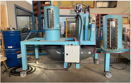 Figure 2. The images of the jig equipment used in the experiments were as follows: (A) piston, (B) motor, (C) water passage duct, (D) jig chamber (enlarged in the figure), and (E) electric panel.