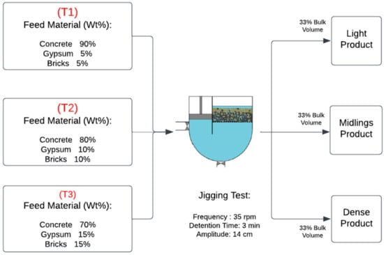 Figure 3 displays the flowchart for the three tests conducted. Made of concrete, gypsum, and brick ranging from 5 to 20 mm, the tests were performed in a single jigging stage, producing three different products. Each material was collected in 6 cm layers within a jigging bed, representing 33% of the total volume of each material’s chamber. Tests T1, T2, and T3 (shown in red in the figure) were conducted separately using the same jigging parameters, with variations in the amount of each element to simulate a C&DW with different contaminant concentrations and produce three distinct products. The jigging bed for all tests was 18 cm deep, with the light material located in the first 6 cm (18–12 cm), the medium-weight material in the middle 6 cm (12–6 cm), and the densest material at the bottom of the bed, comprising the last 6 cm (6–0 cm), which terminates at the jig sieve.