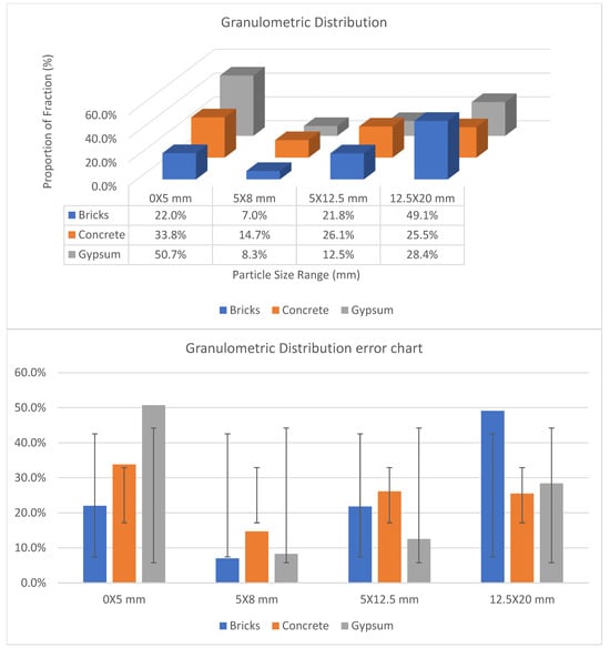 Figure 4. Granulometric distribution of concrete, gypsum, and brick with a 5 × 20 mm range.