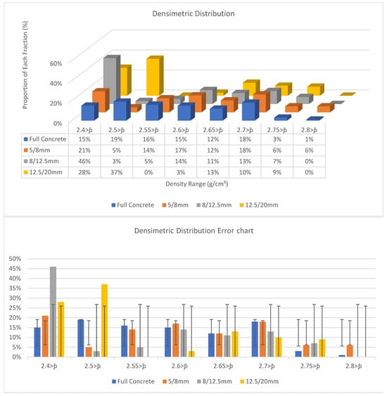 Figure 5. Densimetric distribution graphics for concrete across all size ranges. Full concrete represents whole concrete, and 5/8 mm, 8/12.5 mm, and 12.5/20 mm represents the sizes of particles in the following ranges: 5 and 8 mm, 8 and 12.5 mm, and 12.5 and 20 mm.