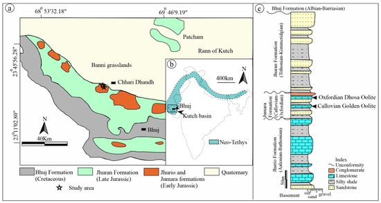 Geological map showing outcrop of Mesozoic sediments of the Kutch Basin, map modified after [48] (a). Map of India within the inset showing the extent of the Neo-Tethyan ocean [11] (b). Composite log of the study area with relevant stratigraphic elaborations (c) [48,49,50]. Litholog showing the ironstone intervals in the Jumara Formation with relevant stratigraphic details (arrows marking Oxfordian Dhosa Oolite and Callovian Golden Oolite) (c).
