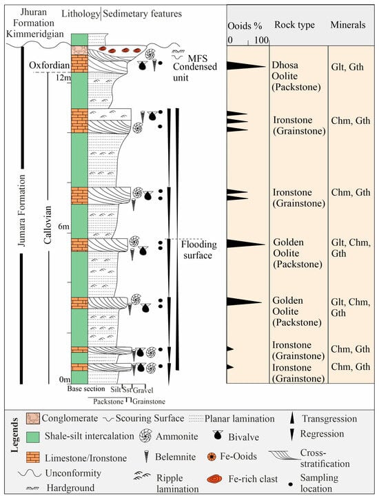 The Oxfordian ironstone bed with a less than 2 m thick deposit has been interpreted as a condensed horizon by the previous workers [43,44,52], forming an oolitic limestone bed that is widespread in the Kutch mainland, indicating a pronounced stratigraphic condensation. The Oxfordian oolitic limestone represents a major transgression in Neo-Tethys that led to the formation of iron ooids, hardgrounds, intraformational conglomerate, and ferruginous crust at the top of the conglomerate bed (Figure 2) [44]. The abundance of iron ooids in the oolitic limestone (Dhosa oolite), along with the presence of glauconitic smectite, reflects deposits corresponding to the Oxfordian maximum flooding surface (MFS). The lag conglomerate at the top of the Dhosa Oolite bed indicates unconformity lying on the top of the Oxfordian deposits.