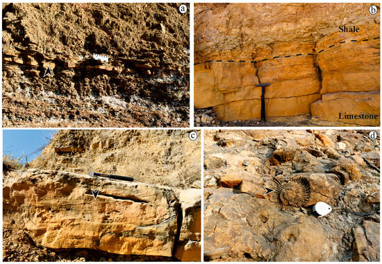 Field photographs showing shale facies containing thin siltstone beds (marked with arrow) in between (a), facies transition from limestone to shale ((b), hammer length 12 inches), cross-bedded oolitic limestone (c), external mold of an ammonite in Dhosa Oolite ((d); lens length = 21 mm).