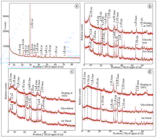 The randomly oriented X-ray diffraction analysis shows strong reflections 3.8 Å (012), 3.0 Å (104), and 2.0 Å (202) with maximum intensity at (104) planes, confirming calcite (Figure 5a) [55] that masked the other mineral peaks. The basal peaks of 10 Å (001), 5.0 Å (002), 4.5 Å (020), and the (001) to (002) reflection intensity ratio are characteristic of glauconite [17,55,59,60,61] (Figure 5b,d). The distance between the (001) and (020) reflections indicates the slightly evolved nature of glauconite [62]. The change in intensity of the (001) basal reflection after heating suggests smectite interstratification in the glauconite [23,60,63]. The prominent 7.2 Å peak, observed in the air-dried and glycolated samples, corresponds to the (001) reflection of kaolinite (Figure 5b), which collapses after heating at 550 °C. The peak shift from 14.6 Å (air-dried) to 15.0 Å after glycolation represents a swelling-type of clay mineral (Figure 5c). However, the appearance of two different diffraction patterns at 13.2 Å and 10.3 Å after heating indicates the presence of two distinct minerals, with 13.2 Å peaks partially masked by the broad peak of the swelling clay (Figure 5c). The presence of the 13.2 Å (001) peak (Figure 5c), along with the other prominent peaks at 7.2 Å (002), 4.7 Å (003), and 3.4 Å (004), throughout air-dried, glycolated, and heated samples, confirms chamosite, with the (002) reflection showing the maximum intensity (Figure 5c,d). The swelling-type of clay with the 14.6 Å peak (air-dried) expands up to 15 Å and then collapses at 10.3 Å after heating, which is identified as montmorillonite [55] (Figure 5c). The (001) reflection of chamosite and montmorillonite overlap at 14.6 Å and 15.0 Å in the air-dried and glycolated samples, and are separated after heating, indicating the presence of two different minerals (Figure 5c). The strong diffraction peaks in the air-dried samples at 4.1 Å (101), 2.68 Å (301), and 2.5 Å (210) indicate the presence of goethite, which remains unchanged after glycolation. However, the shifts in peaks at 3.6 Å (012), 2.69 Å (104), 2.5 Å (110), and 1.6 Å (116) after heating at 550 °C (Figure 5b,d) correspond to hematite, indicating that goethite transforms to hematite upon heating.