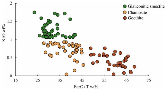 The cross-plot between Fe2O3T vs. K2O shows three broad clusters corresponding to glauconitic smectite, chamosite, and goethite.