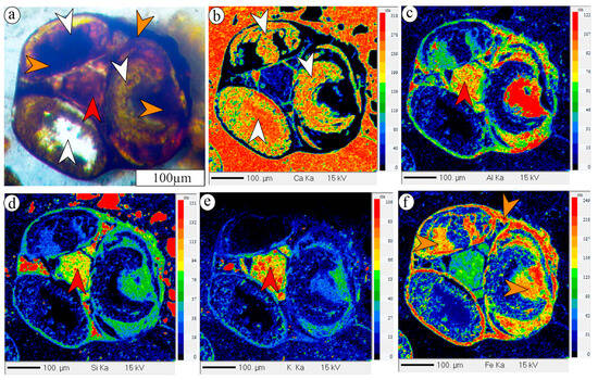 Photomicrograph of composite ooids containing calcitic nucleus (white arrows) infilled with iron silicates (a). Elemental mapping of the same grain showing compositional variation of Ca (b), Al (c), Si (d), K (e), and Fe (f). Note: Ca-enriched portion indicates calcite. K-depleted, Fe-enriched iron silicate marked with orange arrows marks chamosite. K-enriched variety of iron silicate marked with a red arrow within a composite ooid identified as glauconitic smectite.