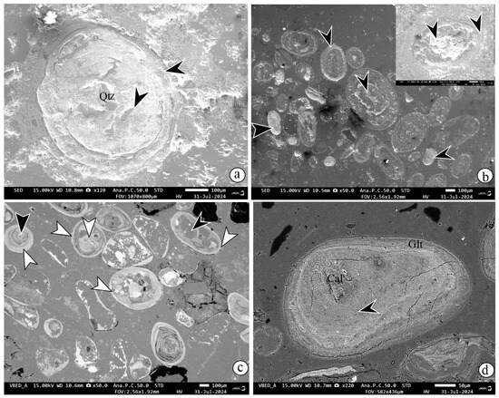 SEM-EDS images showing three types of ooids. (i) Quartz nucleus surrounded by chamosite rim (mark with black arrow) (a). Monomineralic ooids, where chamosite precipitated in the intraparticle pores of bioclastic nuclei, surrounded by chamositic rim and chamositic peloids (marked with black arrows) (b). Monomineralic goethitic ooids (marked with white arrow) (c). Composite ooids, chamosite in the core (marked with black arrow), and goethite in the rim (marked with white arrow) (c). Composite ooids showing (a) chamosite nucleus (marked with black arrow) with relics of calcite surrounded by glauconitic smectite (d). (Mineral abbreviations: -Qz—quartz, Glt—glauconitic smectite, Cal—calcite).