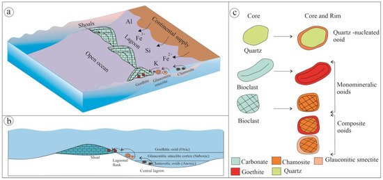 Iron ooids are broadly of three types: (i) monomineralic ooids composed entirely of chamosite or goethite, (ii) quartz-nucleated with a chamositic rim, and (iii) composite ooids with distinct core-rim show mineralogy, such as (a) chamosite core and goethite rim, and (b) chamosite core and glauconitic smectite rim (Figure 10c). Glauconite and glauconitic smectite typically form in suboxic conditions [72,73,74,75,76,77], chamosite in anoxic conditions [72,78], and goethite in oxic conditions [72,79]. The sharp mineralogical contrast between the core and rim of the composite ooid indicates formation in different depositional settings within the shoal-lagoon complex. Petrographical observation further suggests an autochthonous to para-autochthonous origin. The compositional variation of the composite ooids indicates fluctuation in depositional redox conditions [80]. Authigenesis of glauconitic smectite and chamosite occurs at a very early stage of diagenesis, close to the seafloor, but under contrasting environments [19,74,75,81,82]. Glauconitic smectite precipitates at the margin of a lagoon in suboxic conditions. Chamosite primarily forms by replacing calcitic bioclasts, and also as precipitates in the cortex (Figure 10b,c) in anoxic lagoon. Goethite may have formed through two possible pathways: either as an alteration product of iron silicate on the sea floor or as a newly precipitated mineral under oxic conditions. In either case, its formation requires oxic depositional conditions. Goethite can form directly as a product of continental weathering in the marginal marine setting under oxic conditions [83].