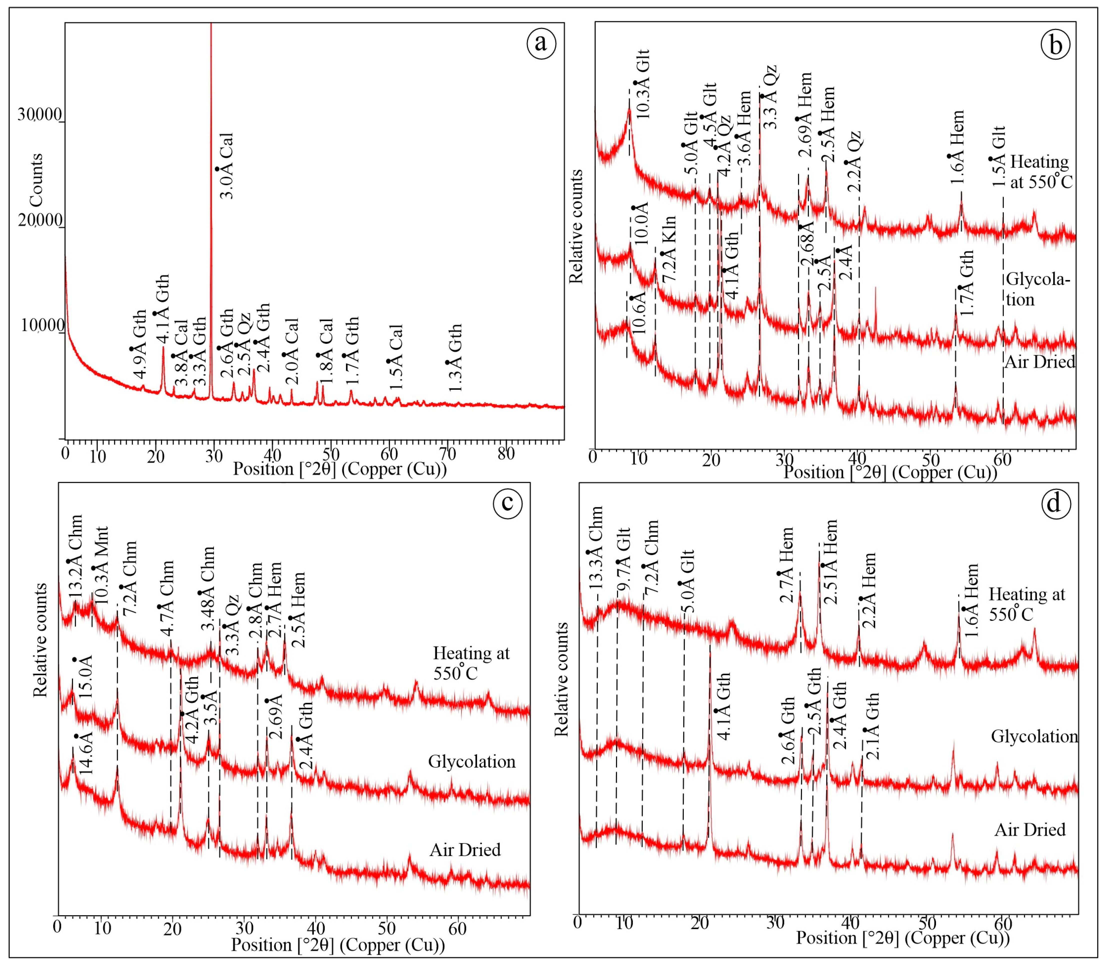 | 4.2 Å, 3.8 Å, 2.69 Å, and 2.4 Å | Peak remains unchanged | 2.7 Å, 2.5 Å | Goethite (after heating at 550 °C, goethite alters to hematite) | |