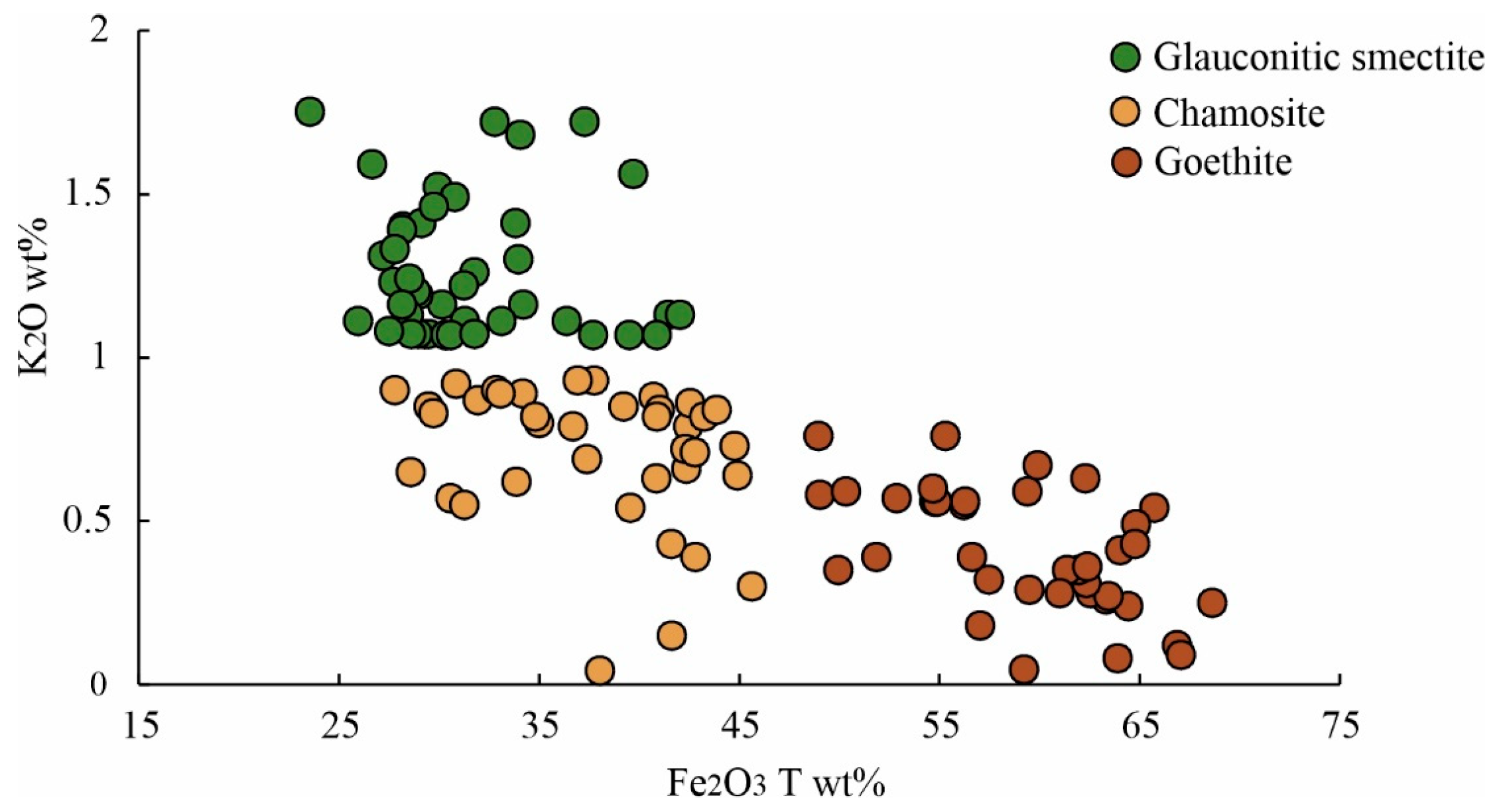 - The distinct compositional contrast between core and rim indicates their formation in different redox conditions. Glauconitic smectite develops in the suboxic settings, chamosite forms in the anoxic conditions, and goethite ooids precipitate under oxic conditions, within the different sub-environments of the bar-lagoon complex.