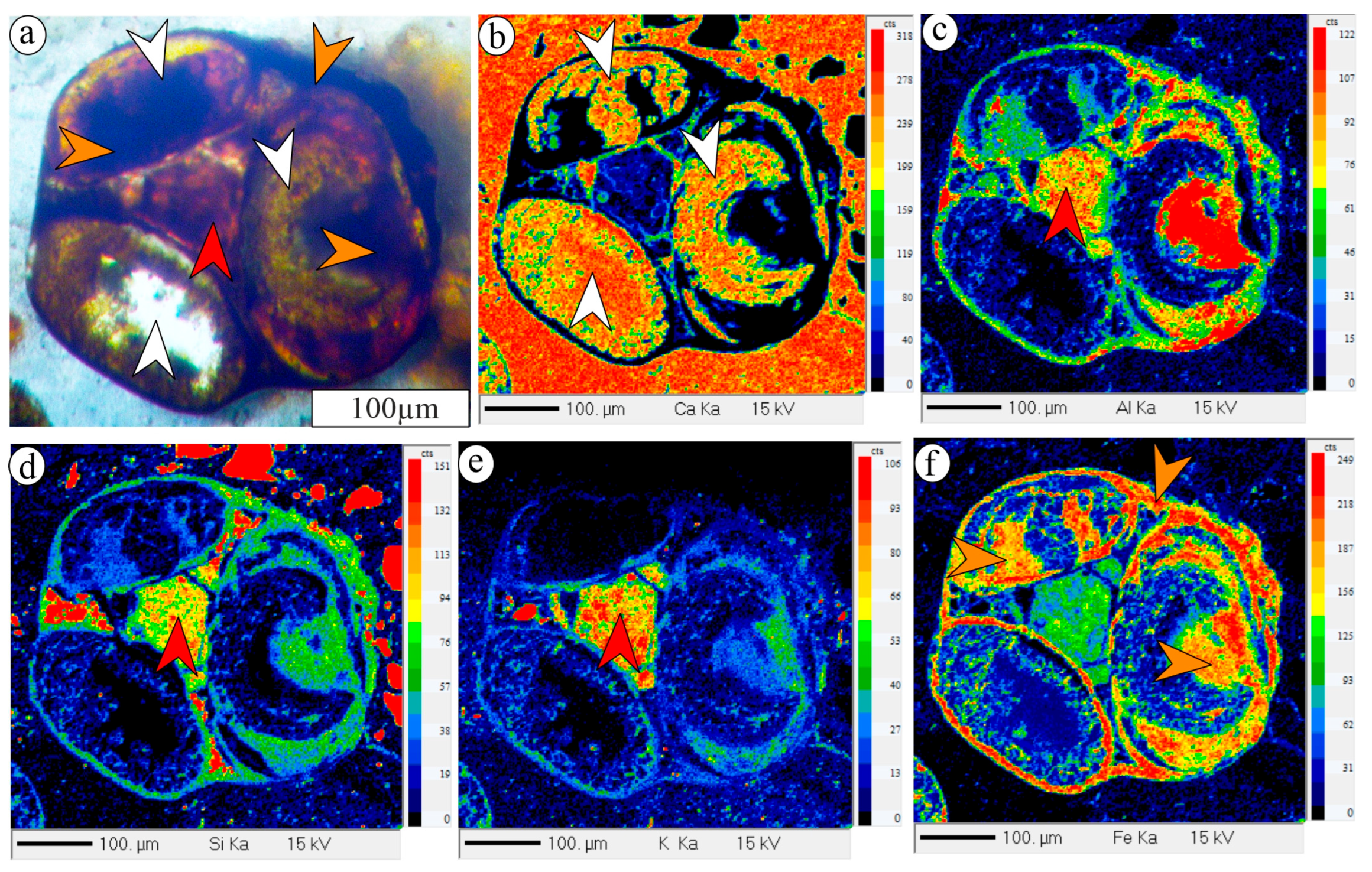 - Chen, S.; Zeng, M.; Tian, J.; Ren, K.; Wang, B.; Zhao, Z.; Chen, X.; Ettensohn, F.R.; Adatte, T. Microbe-Mediated, Marine Authigenic Formation of Ooidal Chamosite: Insights from Upper Ordovician Carbonates of the South-Western Yangtze Platform (China). Sedimentology 2023, 70, 1655–1678. [Google Scholar] [CrossRef]