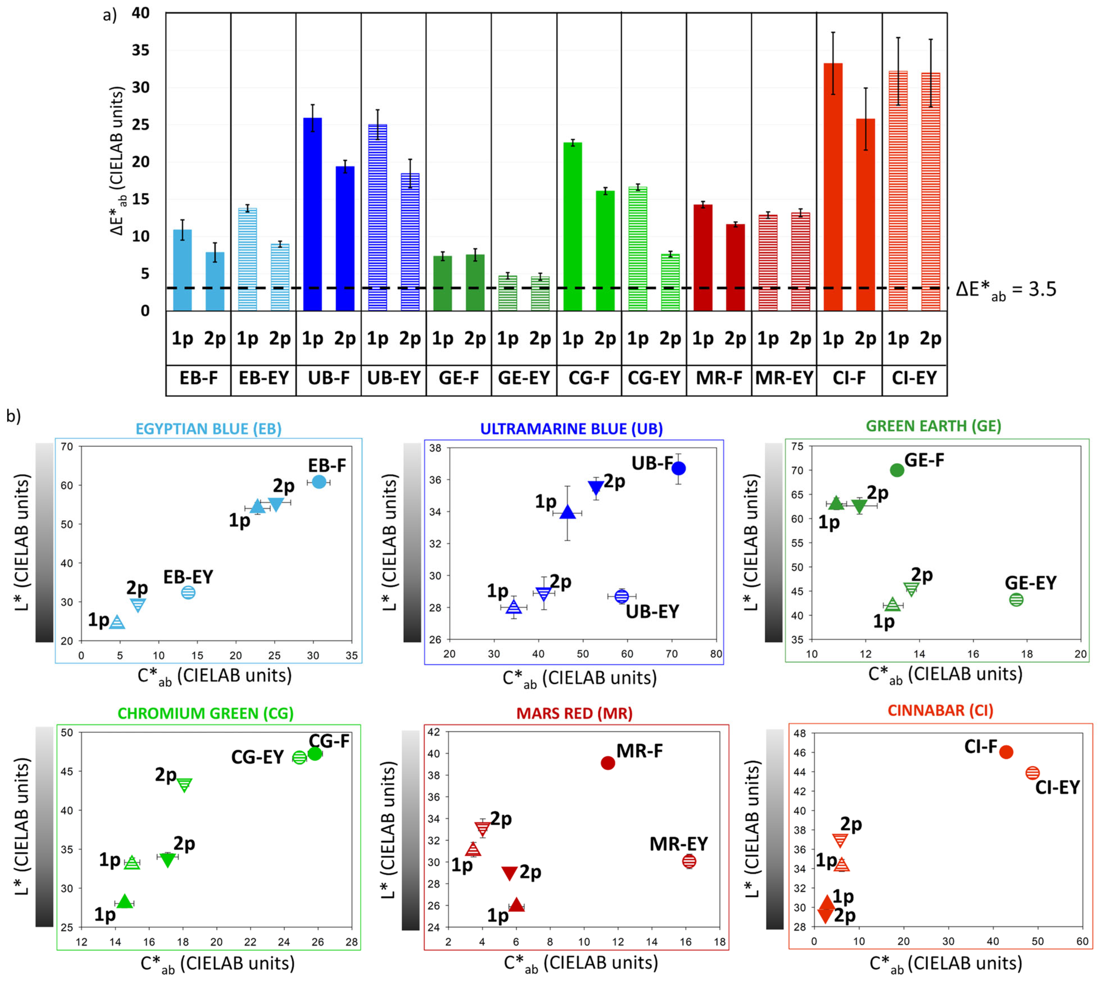 - The colour was characterized by colour spectrophotometry using CIELAB and CIELCH colour spaces [47], measuring L* (lightness), a* and b* (colour coordinates), C*ab (chroma), and h (hue) by means of a Minolta CM-700d spectrophotometer (Tokyo, Japan). L* represents lightness, varying from 0 (black) to 100 (white). The other two parameters are chromaticity coordinates: a* goes from red to green (where +a* is red and -a* is green) and b* from yellow to blue (+b* is yellow and -b* is blue). C*ab is calculated according to the following formula: C*ab = (a2 + b2)1/2 and h is calculated by means of the expression h = tan [1 − (a*/b*)].The measurements were made in the specular component excluded (SCE) mode, for a spot diameter of 8 mm, using illuminant D65 at an observer angle of 10°. A total of five measurements were made on unaged paint mock-ups and artificially aged mock-ups (before and after radiation). ΔL*, Δa*, Δb*, ΔC*ab, and ΔH* and colour difference (ΔE*ab = [ ΔL*2 + Δa*2 + Δb*2]1/2) were calculated between the non-irradiated and the irradiated areas following [48].