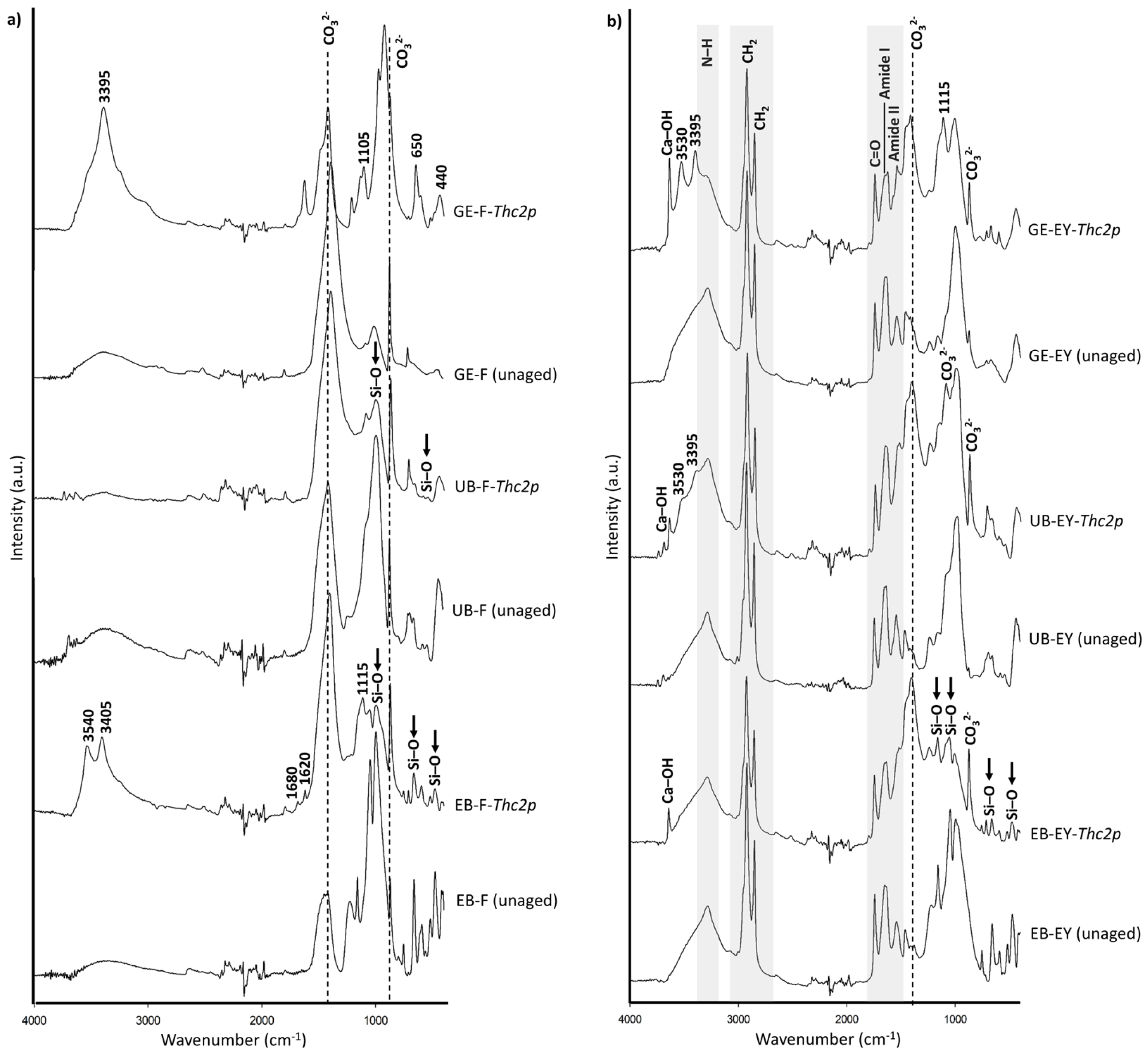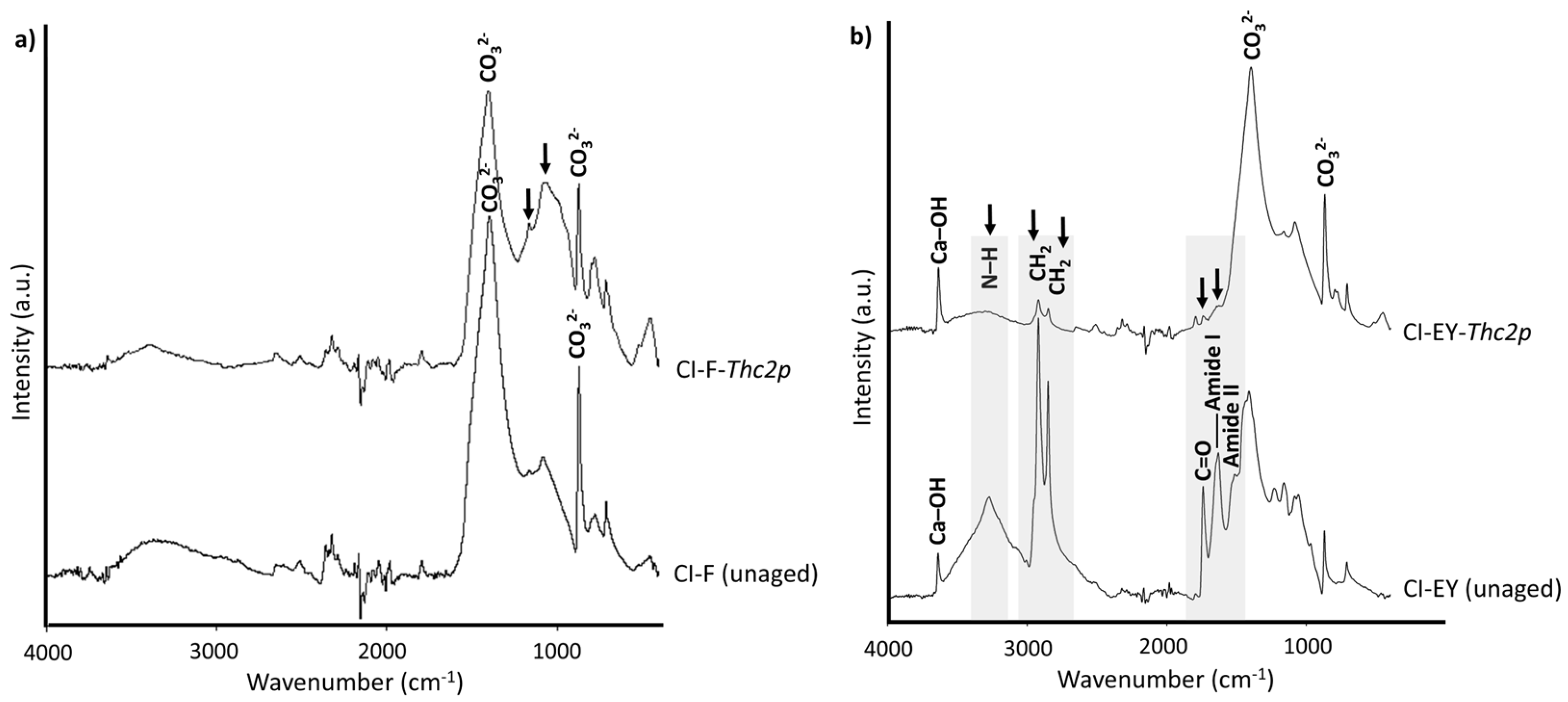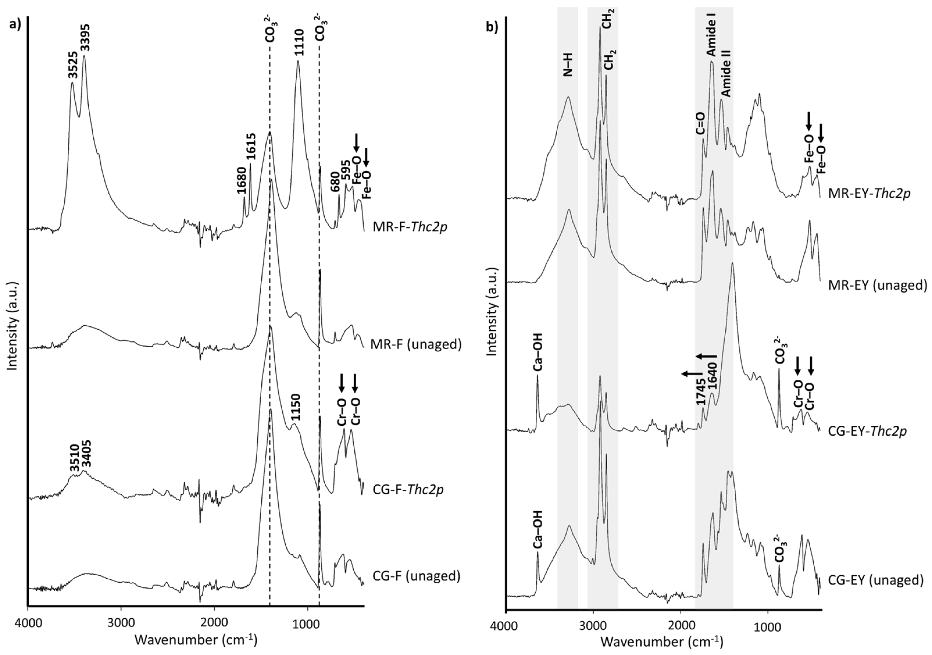 - The molecular composition of the pigments and soot was obtained by Attenuated Total Reflectance Fourier–Transform Infrared Spectroscopy (ATR-FTIR), using a Thermo Nicolet 6700 (Thermo Fisher, Waltham, MA, USA) at a 2 cm−1 resolution over 32 scans in the mid infrared spectral region (400–4000 cm−1).