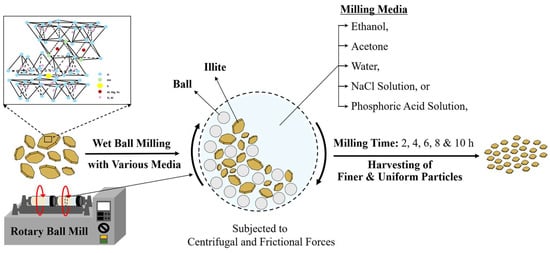 Clay minerals such as illite serve as essential resources across various industries, and their particle size and distribution significantly influence their physicochemical properties. Finer particles exhibit enhanced moisture-retention ability and interfacial interactions, making them suitable for analytical and functional applications. These attributes also contribute to the performance and practical function of clay-based materials [13]. Particle-size control has been achieved through mechanical processes, including ultrasonication, planetary milling, ball milling, air-jet milling, vibration milling, tumbling milling, and attrition milling [14,15,16,17,18]. Mechanical grinding is particularly promising because it not only produces fine mineral powders but also induces structural or chemical modifications, thereby enhancing their inherent properties or imparting new functionalities [19,20].