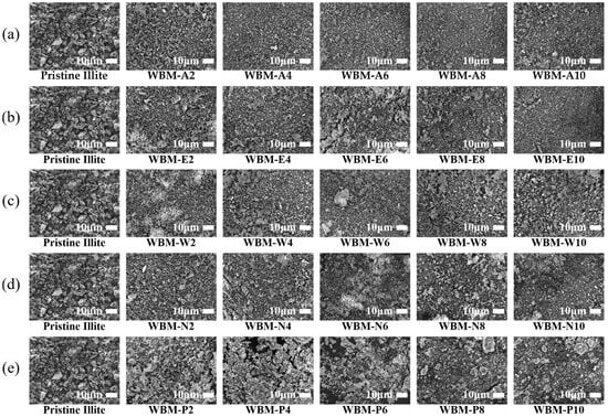 SEM images of illite particles before and after wet ball milling (WBM) with different milling media (acetone, ethanol, water, aqueous NaCl solution, and aqueous phosphoric acid solution) and milling times (0, 2, 4, 6, 8, and 10 h). Illite particle samples milled in (a) acetone, (b) ethanol, (c) water, (d) aqueous NaCl solution, and (e) aqueous phosphoric acid solution.