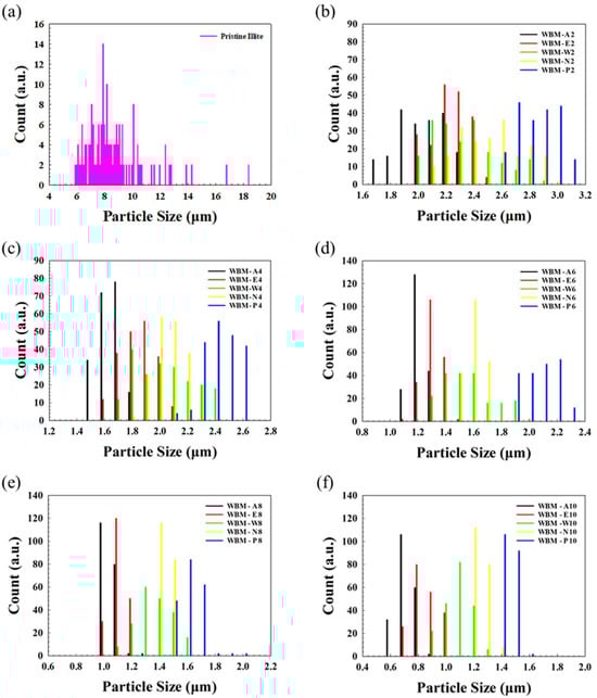 Particle size distributions (PSDs) of illite particles before and after wet ball milling (WBM) using different milling media (A: acetone, E: ethanol, W: water, N: aqueous NaCl solution, and P: aqueous phosphoric acid solution) and various milling times. (a) Pristine illite particles and (b–f) illite particle samples milled for 2, 4, 6, 8, and 10 h, respectively.