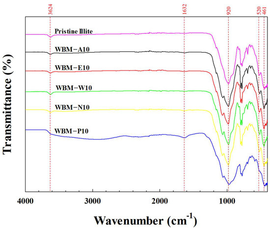 The FT-IR spectra of pristine illite particles and illite particles ball-milled for 10 h using five different milling media (A: acetone, E: ethanol, W: water, N: aqueous NaCl solution, and P: aqueous phosphoric acid solution) are shown in Figure 6. The absorption bands observed at 3624 cm−1 and 1632 cm−1 are attributed to the O–H stretching vibration of structural hydroxyl groups in illite particles [38] and the H–O–H bending vibration of residual interlayer or hydrogen-bonded water molecules [39,40], respectively. The absorption bands at 920 cm−1, 520 cm−1, and 461 cm−1 correspond to Al–OH–H bending [41], Si–O stretching [42], and O–Si–O bending vibrations [43], indicating the characteristic aluminosilicate lattice of illite.