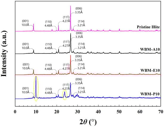 XRD patterns of pristine illite and illite particles ball-milled for 10 h in three different milling media: acetone (WBM-A10), ethanol (WBM-E10), and aqueous phosphoric acid solution (WBM-P10), over the 2θ range of 0–70°. The characteristic illite reflections indexed to the (001), (110), (006), and (114) crystallographic planes are marked, and the d-spacings (Å) of the major reflections are provided to facilitate phase identification. The notable emergence of reflections at 2θ ≈ 10° and 23.4° in the WBM-P10 pattern is highlighted in yellow.
