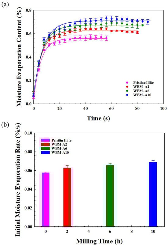 As the wet ball-milling process progressively reduced particle size and increased the surface area of illite, the moisture-evaporation and retention behavior also changed significantly, reflecting the combined effects of surface exposure and diffusion-limited moisture transport within the milled illite particles. Figure 9a and Figure 9b show the moisture evaporation content (MEC) as a function of time and the initial evaporation rate (RiM) values for pristine illite particles and the illite particles ball-milled in acetone for 2, 6, and 10 h (WBM-A2, WBM-A6, and WBM-A10), respectively. To quantitatively elucidate the evaporation dynamics and establish a definitive mathematical dependency on milling duration, the MEC profiles in Figure 9a were fitted using a first-order kinetic model (3-parameter exponential rise function): MEC(t) = yi + c · (1 − e−dt). In this framework, yi represents the baseline offset, c denotes the asymptotic evaporation capacity (maximum moisture content), and d serves as the evaporation rate constant. This model explicitly captures both the early-stage evaporation kinetics and the long-term moisture retention behavior within a unified mathematical framework. The fitted kinetic parameters (yi, c, and d) obtained from this model are summarized in Table 5, along with the corresponding coefficients of determination (r2), providing a quantitative comparison of moisture-evaporation behavior as a function of milling time. For all samples, the MEC initially increased sharply, and their RiM were 0.058 ± 0.001%, 0.063 ± 0.003%, 0.065 ± 0.002%, and 0.069 ± 0.002%, respectively, indicating a gradual increase with milling time. The faster initial evaporation observed for samples with longer milling times reflects their reduced particle size and enlarged SBET, both of which accelerate early-stage moisture release. The high statistical correlation (r2 > 0.99 for all systems) confirms that moisture release follows a well-defined kinetic pathway, governed by the structural evolution of the illite aggregates. In addition, the maximum moisture content, represented by the evaporation capacity parameter (c), increased steadily with the values of 0.57 ± 0.002%/s, 0.64 ± 0.01%/s, 0.70 ± 0.01%/s, and 0.73 ± 0.03%/s for pristine illite particles, WBM-A2, WBM-A6, and WBM-A10, respectively. This monotonic increase in the c values directly correlates with the increased SBET, indicating enhanced water adsorption capacity associated with expanded external surfaces and newly formed mesoporous structures. Meanwhile, the evaporation rate constant (d) reflects the accelerated mass transfer through the newly developed mesoporous network. Despite exhibiting higher RiM, the samples showed higher maximum moisture content and longer retention times. In particular, WBM-A10 retained its highest maximum moisture content for the longest period. This behavior is attributed to the greater moisture adsorption capacity associated with reduced particle size and enlarged surface area [49].