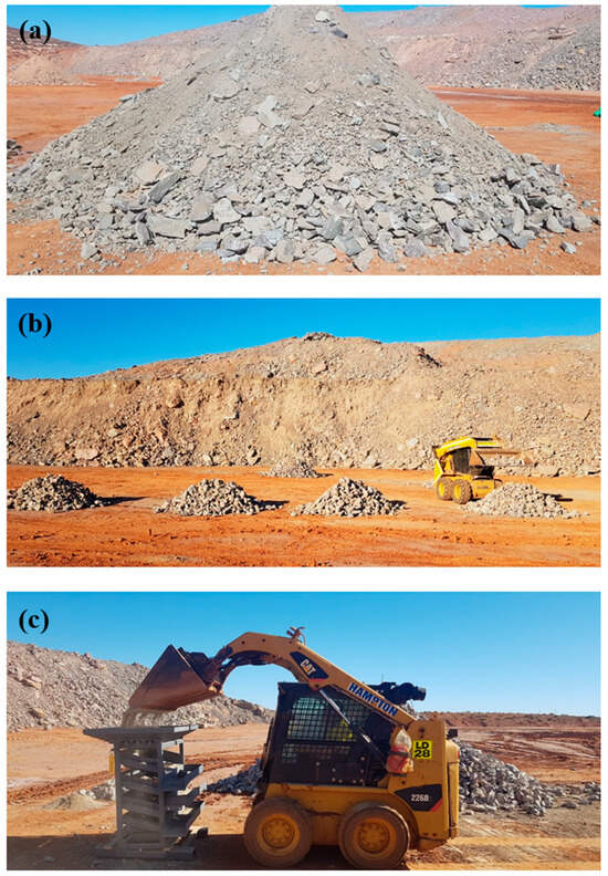 Five ore domains classified as A, B, C, D and E were selected from three mining sites in Western Australia. Site 1: gold ore (Open-Pit Gold Mine, Western Australia near Kalgoorlie), site 2: nickel ore (Underground Mine, Western Australia near Leonora), and site 3: gold ore (Gold Mine in the Goldfields region of Western Australia). Approximately 50 ton of run-of-mine (ROM) ore that passed through a mobile crusher with a top size of ~180 mm and made to a single cone-like pile was collected from each domain (Figure 1a). In order to gain as representative a sub-sample as possible, a cone and quartering sampling method was applied where quarters were created from the initial stockpile, and two quarters were taken to make up a new pile. This procedure was repeated until a sub-sample of 2–3 tons was left (Figure 1b). In the next step, the 2–3 ton sub-samples from each ore domain were then screened to produce +110 mm, −110 + 70 mm, −70 + 45 mm, and −45 mm size fractions using a custom-made screening rig (Figure 1c). The −45 mm material was then screened by using 26.5 mm and 9.5 mm sieve apertures, creating −45 + 26.5 mm, −26 + 9.5 mm, and −9.5 mm size fractions.