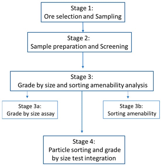All size fractions were sent for grade by size analysis to determine the mean grade of each size fraction for each ore domain. The effective range for particle sorting lies between ~10 mm and ~100 mm in the current sorting technology. Thus, the middle 4 fractions (−110 + 70, −70 + 45, −45 + 26.5 and −26.5 + 9.5 mm) were sampled for particle sorting test work. The grade of each size fraction was determined through a mass of rock taken from each size fraction, while individual assays were conducted on rocks subsequent to particle sensing. The overall tasks and procedures completed to achieve the objectives is shown in Figure 2.