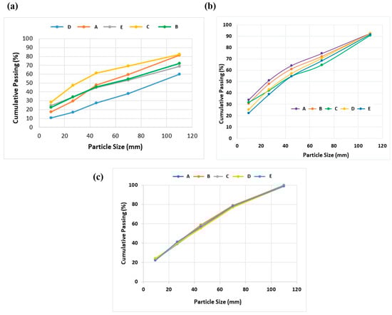 The particle size distribution of each ore domain obtained after screening from site 1 is shown in Figure 4a. Results indicate that the ore domain (C) exhibits the highest proportion of fines, while the domain (D) displays a comparatively coarser size distribution. (A), (B), and (E) show relatively similar size distributions. Similarly, PSD of each ore domain obtained after screening from sites 2 and 3 is illustrated in Figure 4b,c, respectively. Figure 4b depicts a fairly consistent output size from the crusher for all samples, with the particle sizes varying from 79 to 90 mm and similar mass distributions between each size fraction across the samples. Likewise, Figure 4c also suggests that all ore domains show relatively similar size distributions. The similarities in PSD observed could be attributed to the similarities in the intrinsic hardness of the ores, while any differences in PSD observed could be due to any variations in the mining methods employed at different sites [19].