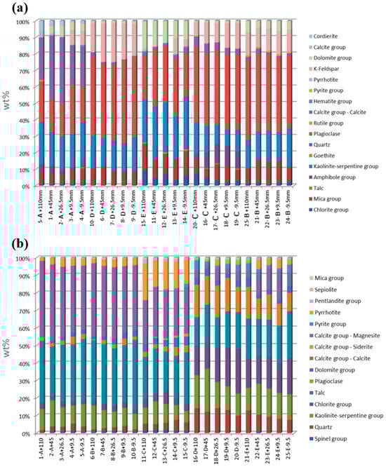 Figure 5a presents the quantitative XRD analysis of crystalline phases from Site 1. In all ore domains, plagioclase ((Na, Ca)Al(Al, Si)Si2O8) was identified as the main mineral phase, accounting for 45%–50% in some cases. The other main phases identified were quartz, K-Feldspar, and the mica group. It can be seen from Figure 5a that the variation in mineral abundance with particle size is neither systematic nor significant for all ore domains. Similarly, quantitative XRD analysis (crystalline phases) of site 2 is also shown in Figure 5b. In ore domains A-C, calcite group (magnesite) and talc (Mg3Si4O10(OH)2) were identified as the two main phases accounting for >70% in A and B, and about 50% in C. The other main phases identified were quartz, K-Feldspar, and the mica group. Kaolinite-serpentine group and pyrrhotite are the other main phases in A-C. Quartz, kaolinite-serpentine group, chlorite group, talc, and plagioclase appear to be evenly distributed in D and E. For a given ore domain, the variation in mineral abundance with particle size is not substantial. These results suggest that there may be limited sorting potential with particle size. However, there is significant mineralogical variation and some mineralogical differences from one ore domain to the other for reported sites 1 and 2, respectively, and thus, each ore domain may respond differently to ore sorting.