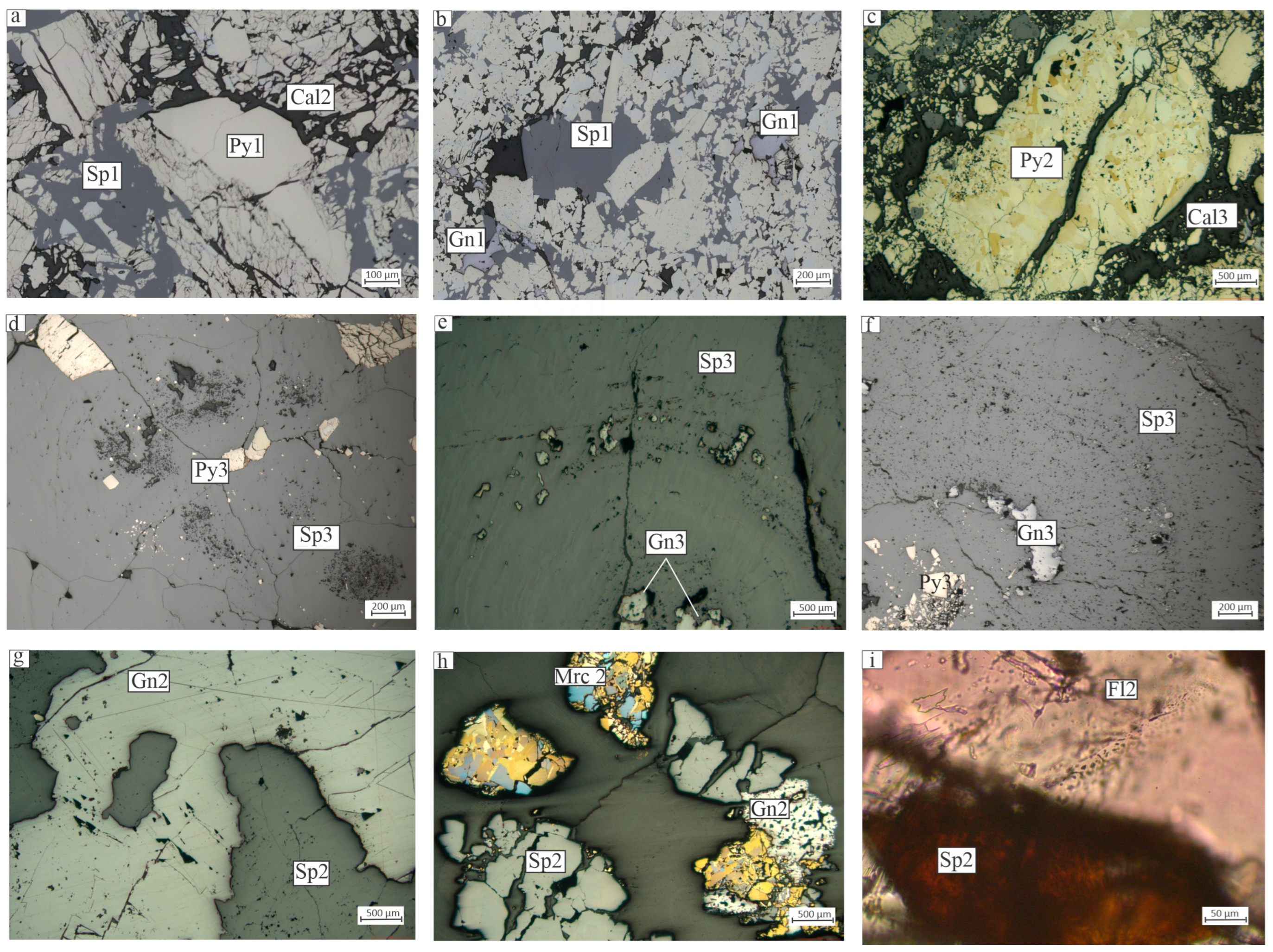 - Yang, Q.; Liu, W.H.; Zhang, J.; Wang, J.; Zhang, X.J. Formation of Pb–Zn Deposits in the Sichuan-Yunnan-Guizhou Triangle Linked to the Youjiang Foreland Basin: Evidence from Rb-Sr Age and in Situ Sulfur Isotope Analysis of the Maoping Pb–Zn Deposit in Northeastern Yunnan Province, Southeast China. Ore Geol. Rev. 2019, 107, 780–800. [Google Scholar] [CrossRef]