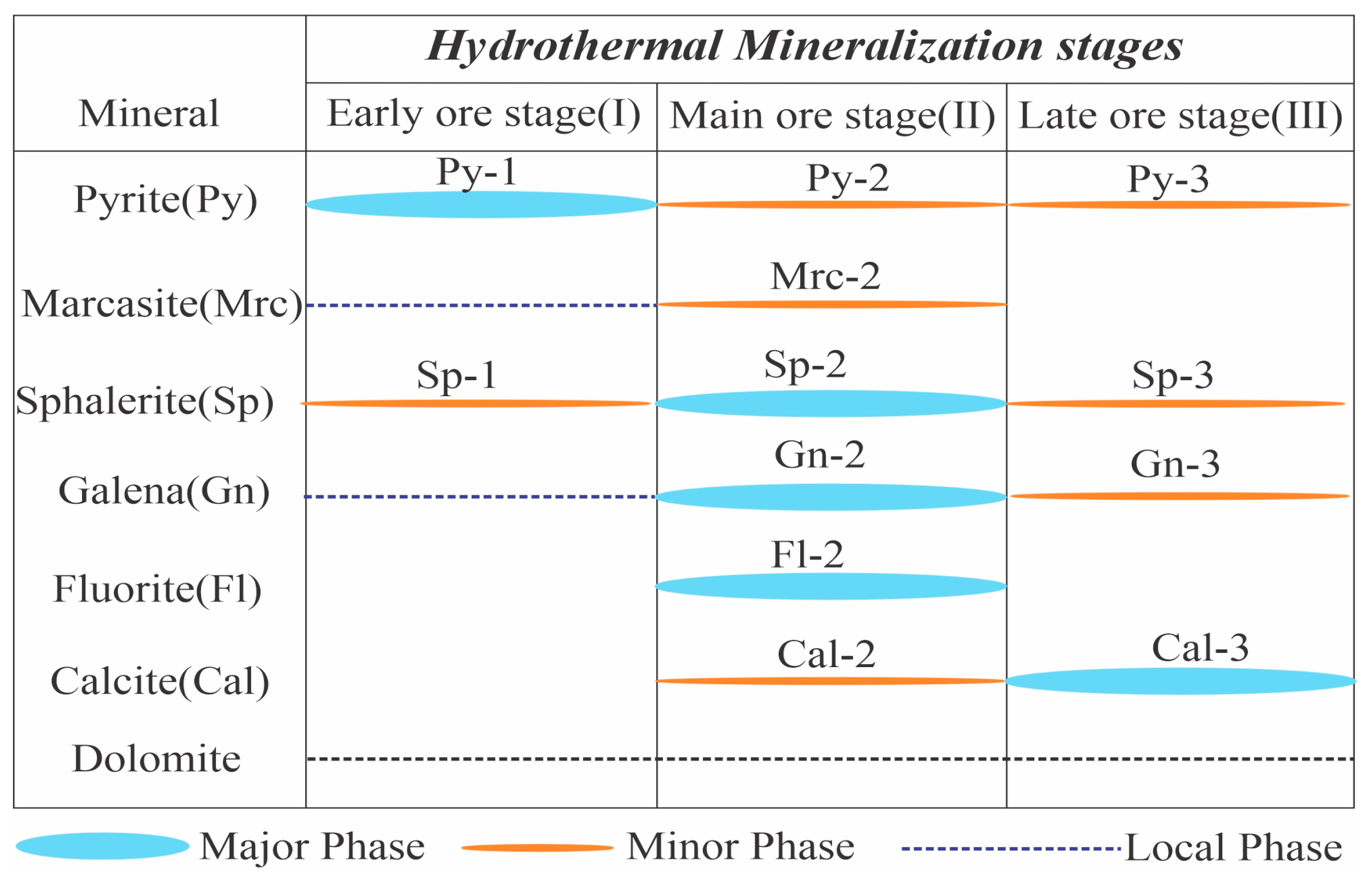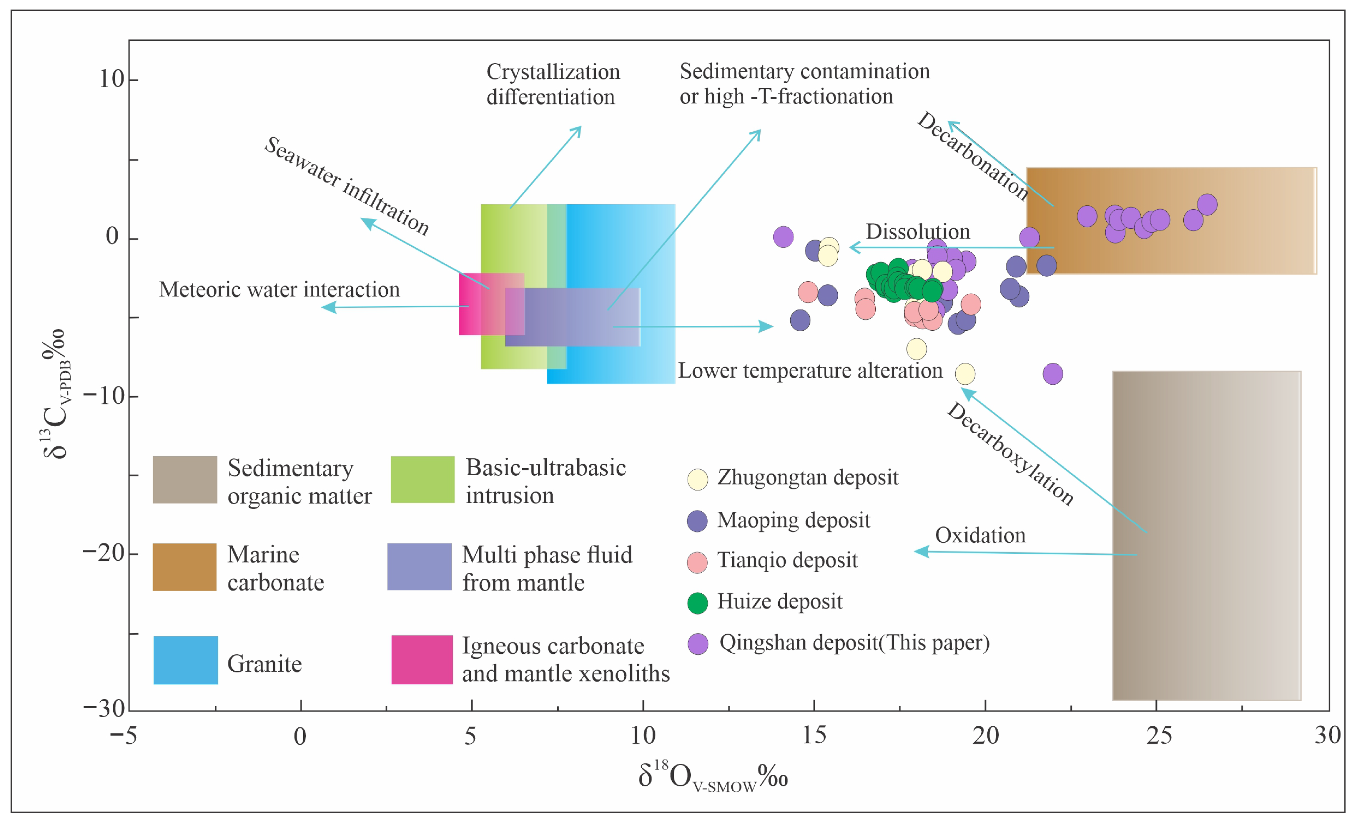 - Ore-stage calcite δ13CV_PDB (−8.60‰ to +2.10‰) and δ18OV_SMOW (14.10‰ to 26.50‰) indicate mixed carbon derived predominantly from marine carbonates, with additional contributions from organic matter, and deep-sourced fluids, reflecting carbonate dissolution and thermochemical sulfate reduction (TSR) during fluid–rock interaction.