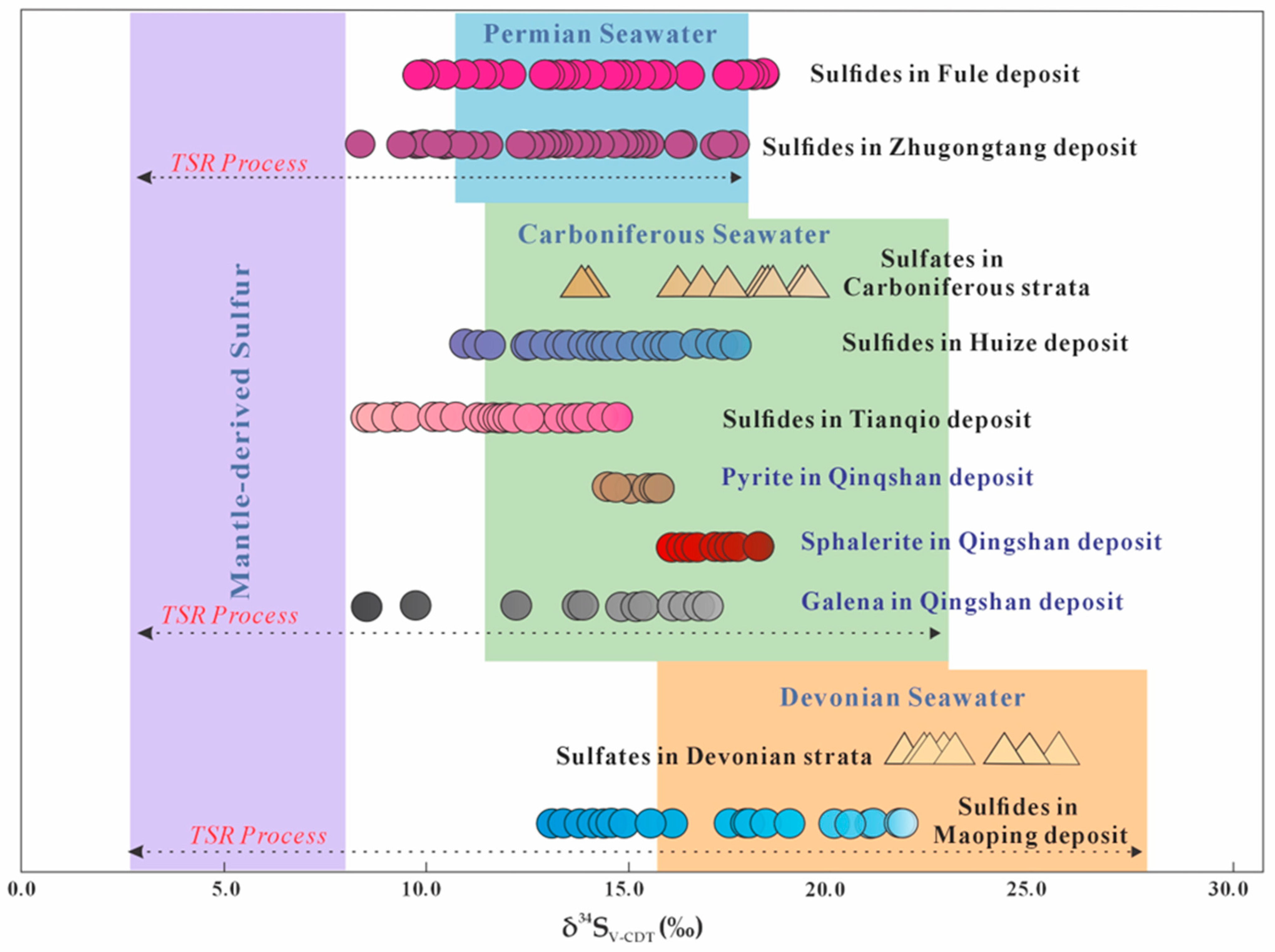 - Positive δ34SV_CDT values (+8.56‰ to +18.29‰), together with fluid temperatures >120 °C, indicate evaporitic sulfate as the principal sulfur source, reduced by thermochemical sulfate reduction (TSR). The heavy sulfur signature, coupled with partial isotopic disequilibrium among coexisting sulfides, indicates dynamic physicochemical conditions involving fluid mixing during ore deposition.